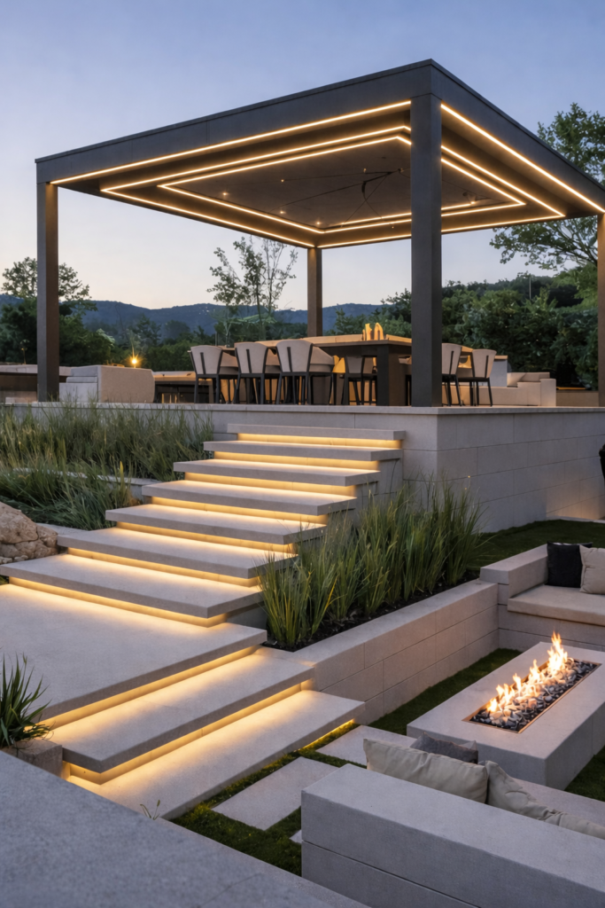 A kültéri világítás a kert hangulatának meghatározó eleme. Az átgondolt, modern világítástervezés nappal diszkréten simul a környezetbe, míg az esti órákban finom fényekkel emeli ki a tér karakterét, egyedi atmoszférát teremtve a pihenéshez és a funkcionalitáshoz.
